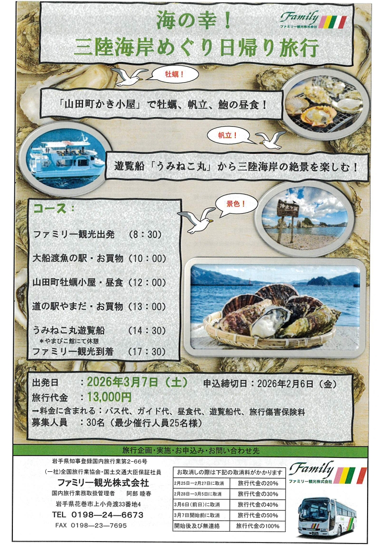 3月072026 【岩手】海の幸!三陸海岸めぐり日帰り旅行 募集中 【岩手】海の幸!三陸海岸めぐり日帰り旅行 大人気企画のカキ食べ放題でお世話になっている山田カキ小屋で、今回は貝盛りミックスをお召し上がりいただきます! うみねこ丸からは三陸山田の美しい景色を望むことができますし、お買い物の時間も取っているので1日で三陸を満喫できるコースとなっております♩ Point! 旬のお魚はここで! 今回のツアー最初の立ち寄りは大船渡魚の駅。ここは令和6年の12月21日にオープンしました。こちらでは鮮魚はもちろん、水産加工品や野菜、お惣菜など幅広く取り扱っています。1番目の立ち寄り地なのでゆっくりお買い物ができるかと思います。お店の方におすすめを聞きながらぜひお買い物をお楽しみください☺ Point! 貝盛りミックスで海の幸を堪能♪ さて今回の大目玉!カキ小屋で貝盛りミックスの昼食です👀!冒頭でも紹介した通り今回はカキをはじめホタテ・ミニアワビなどがお楽しみいただけます!毎年恒例で行っていたのはカキ食べ放題でしたが、こちらも三陸の海の幸をお腹いっぱいお召し上がりいただけます!☺いつもカキ食べ放題をお楽しみいただいている皆様も、初めて参加される方もどなたでもお楽しみいただけます♪ Point! 最後は遊覧船でゆったり♩ 令和3年、58年という長い歴史に幕を閉じた遊覧船。多くの地元民をはじめ県外の方から再開を望む声が上がり、「宮古うみねこ丸」として再復活!😻その長い歴史を受け継ぎ、現在は浄土ヶ浜エターナルグリーンが目を引く美しい船が私たちを乗せて浄土ヶ浜の景色を楽しませてくれます。旅の終わりは海の景色をゆっくりお楽しみください🚢 行程 3月7日(土) ファミリー観光株式会社(8:30発)→大船渡魚の駅(10:00)→山田カキ小屋(12:00)→道の駅やまだおいすた(13:00)→宮古うみねこ丸(14:30)→ファミリー観光株式会社(17:30頃着) 旅行期間/2026年3月7日(土) ◆旅行方面/岩手県 ◆料金/大人お一人様13,000円 ◆募集人員/25名 ◆最少催行人員/30名 ◆食事回数/朝食0回、昼食1回、夕食0回 ◆添乗員/同行 旅行申込単価人数 – 申込可能13000円人 旅行条件書 旅行同意書 お申込みの注意事項 ・料金に含まれるもの/交通費、ガイド代、昼食代、乗船代、乗務員・添乗員経費、旅行傷害保険料 ・料金に含まれないもの/ご自宅から集合(解散)場所までの交通費 ・所要時間/約9時間(8:30頃~17:30頃) ・日数/日帰り ・最少催行人員/25名 お問合せはこちら お電話でのお問合せは ☎︎0198-24-6673 【受付時間】8:30〜17:30(月〜金)