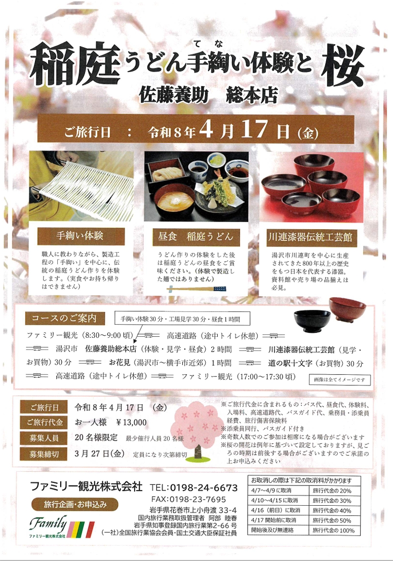 4月172026 【秋田】稲庭うどん手綯い体験と桜 募集中 【秋田】稲庭うどん手綯い体験と桜 今回は、お隣秋田県で有名な稲庭うどんの手綯い体験を組み込んだツアーとなります♩ 実食やお持ち帰りはできませんが、職人さんが普段どのようにあの麺を製造しているのかぜひ体験してみませんか⁇ その後は稲庭うどんのご昼食にお花見も!新年度初のツアー、ぜひご参加ください☺ Point! 職人の技を体験 皆さんもよくご存じの佐藤養助総本店さん。今回はこちらで稲庭うどんの手綯い(てない)体験をしていただきます!稲庭うどんは約350年の歴史を誇り、なめらかな舌ざわりとつるつるとしたのどごしが特徴で、多くの人に評価され、贈答品としても有名です。そんな稲庭うどんに欠かせない製法の中に手綯いという職人技があります。手綯いとは、2本のかけ棒に縄を綯うようにひねりながら、あやがけして細くしていく作業のことだそうです。説明からして難しそうですが・・・おいしい稲庭うどんの裏に隠れた苦労・難しさを実際に体験してみて下さい😲 Point! いざ実食! さて、体験の後はお待ちかねの昼食です♩今回は佐藤養助総本店さんで温かいうどんと冷たいうどんの食べ比べをしていただきます。温度によってどのように食感が違うのか、是非ご賞味ください✨そして、普通のうどんとは違った稲庭うどんならではの平麺の食感も気にかけて召し上がっていただきたいと思います。天ぷらも付いたセットなのでお腹いっぱい楽しむことができるかと思います。😋 Point! ○○年もの歴史ある漆器 湯沢市川連町を中心に生産されてきたこの漆器は、なんと800年もの歴史を誇ります。花塗りという仕上げによって、やさしくふっくらとした質感が生まれることが特徴です。断熱性、保温性、抗菌力に優れた川連漆器。販売コーナーの他、資料館もありますのでぜひのぞいてみて下さい。 行程 4月17日(金) ファミリー観光株式会社(9:00頃発)→佐藤養助総本店→川連漆器伝統工芸館→各所お花見→道の駅十文字→ファミリー観光株式会社(17:00頃着) ◆旅行期間/2026年4月17日(金) ◆旅行方面/秋田県(湯沢市・横手市) ◆料金/大人お一人様13,000円 ◆募集人員/20名まで ◆最少催行人員/20名 ◆食事回数/朝食0回、昼食1回、夕食0回 ◆添乗員/同行 旅行申込単価人数 – 申込可能13000円人 お申込みの注意事項 ・料金に含まれるもの/交通費、ガイド代、昼食代、体験料、乗務員・添乗員経費、旅行傷害保険料 ・料金に含まれないもの/ご自宅から集合(解散)場所までの交通費 ・所要時間/約8時間00分(9:00頃~17:00頃) ・日数/日帰り ・最少催行人員/20名 旅行条件書 旅行同意書 お問合せはこちら お電話でのお問合せは ☎︎0198-24-6673 【受付時間】9:00~18:00(月〜金)