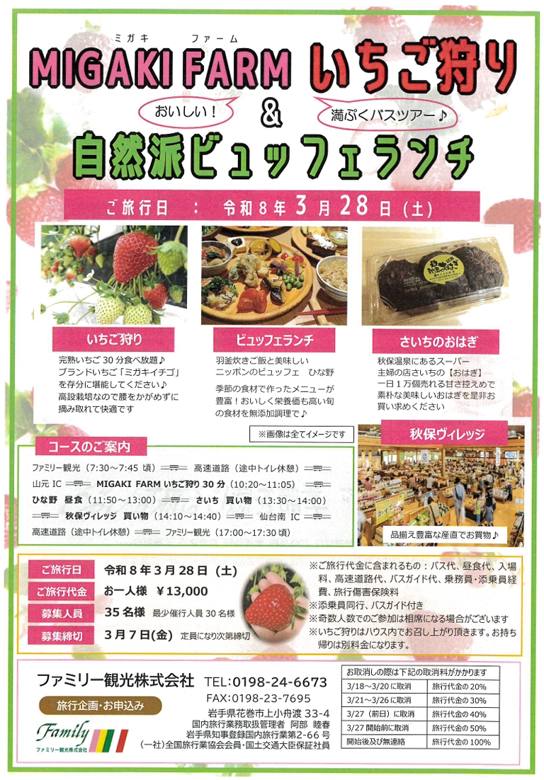 3月282026 【宮城】MIGAKI FARMいちご狩り&自然派ビュッフェランチ 募集中 MIGAKI FARM いちご狩り&自然派ビュッフェランチ 昨年は秋田県で実施したいちご狩りを今年は宮城県にある“MIGAKI FARM”さんで!! 食べる宝石と称されるミガキイチゴを心ゆくまでご堪能下さい♩ひな野さんでのこだわりビュッフェランチや1日に1万個売れるというおはぎまで・・・春を感じつつお腹いっぱいになれる盛りだくさんツアーなので、年度最後のご褒美ツアーとしてぜひぜひご参加ください👏♩ Point! 食べる宝石をご堪能下さい🍓 今回いちご狩りを体験するのはMIGAKI FARMさんです。数ある品種の中から厳選され、徹底した管理の下で育てられたいちご。その中からさらに厳しい基準で選別されたもののみをミガキイチゴ、と呼ぶそうです。今回はそんなミガキイチゴを思う存分お楽しみください♩ ※写真はイメージとなります Point! 自然派ビュッフェで健康的に🍚 今回の昼食はひな野さん。ご存知の方もいるかと思います。ひな野さんは季節の食材をふんだんに使用し、食材の本来の美味しさを味わえるようにしており、さらに無添加調理にもこだわっているので安心です。ビュッフェスタイルなので空腹状況に合わせてお食事をお楽しみください😋 Point! もっちりおはぎをこの機会に😋 今回是非お土産に持って帰っていただきたいのが「主婦の店 さいち」さんにあるおはぎです。こちらは仙台市出身のコンビ、サンドウィッチマンさんもたびたびおおすすめしていることでも有名です。なんと、1日最高2万5千個も売れたことがあるそうです!!手作りの優しさが伝わるような味で、早めに食べると柔らかさが残っていておすすめです✨消費期限は当日‼買い過ぎには注意です(-“-)💦 行程 3月28日(土) ファミリー観光株式会社(7:30頃発)→MIGAKI FARM(10:20~11:05)→ひな野(11:50~13:00)→主婦の店さいち(13:30~14:00)→秋保ヴィレッジ(14:10~14:40)→ファミリー観光株式会社(17:30頃) ◆旅行期間/2026年3月28日(土) ◆旅行方面/宮城県(山元町・仙台市) ◆料金/大人お一人様13,000円 ◆募集人員/35名 ◆最少催行人員/30名 ◆食事回数/朝食0回、昼食1回、夕食0回 ◆添乗員/同行 旅行申込単価人数 – 申込可能13000円人 お申込みの注意事項 ・料金に含まれるもの/交通費、ガイド代、いちご狩り体験料、昼食代、乗務員・添乗員経費、旅行傷害保険料 ・料金に含まれないもの/ご自宅から集合(解散)場所までの交通費 ※いちご狩りはハウス内でお召し上がりいただくもので、お持ち帰りは別料金となりますのでご注意ください。 ・所要時間/約10時間(7:30頃~17:30頃) ・日数/日帰り ・最少催行人員/30名 旅行条件書 旅行同意書 お問合せはこちら お電話でのお問合せは ☎︎0198-24-6673 【受付時間】9:00~18:00(月〜金)